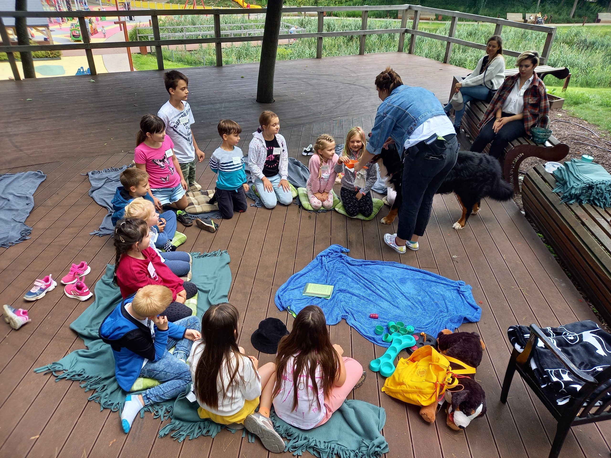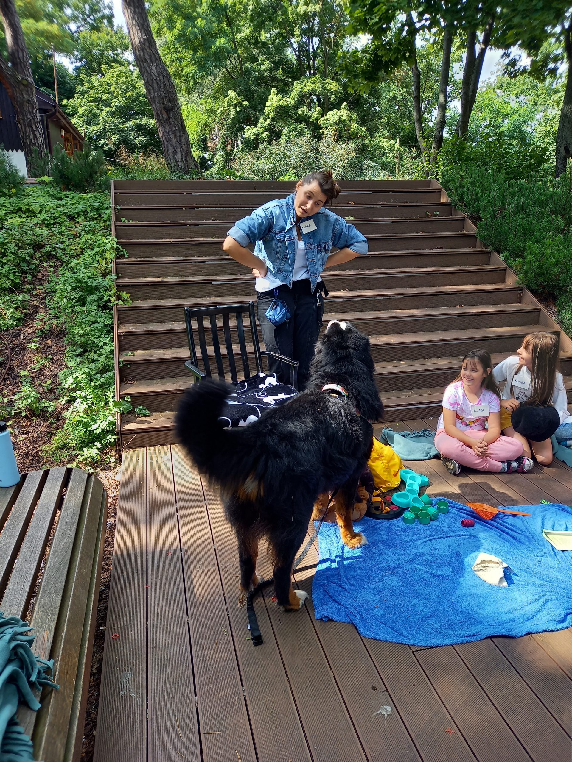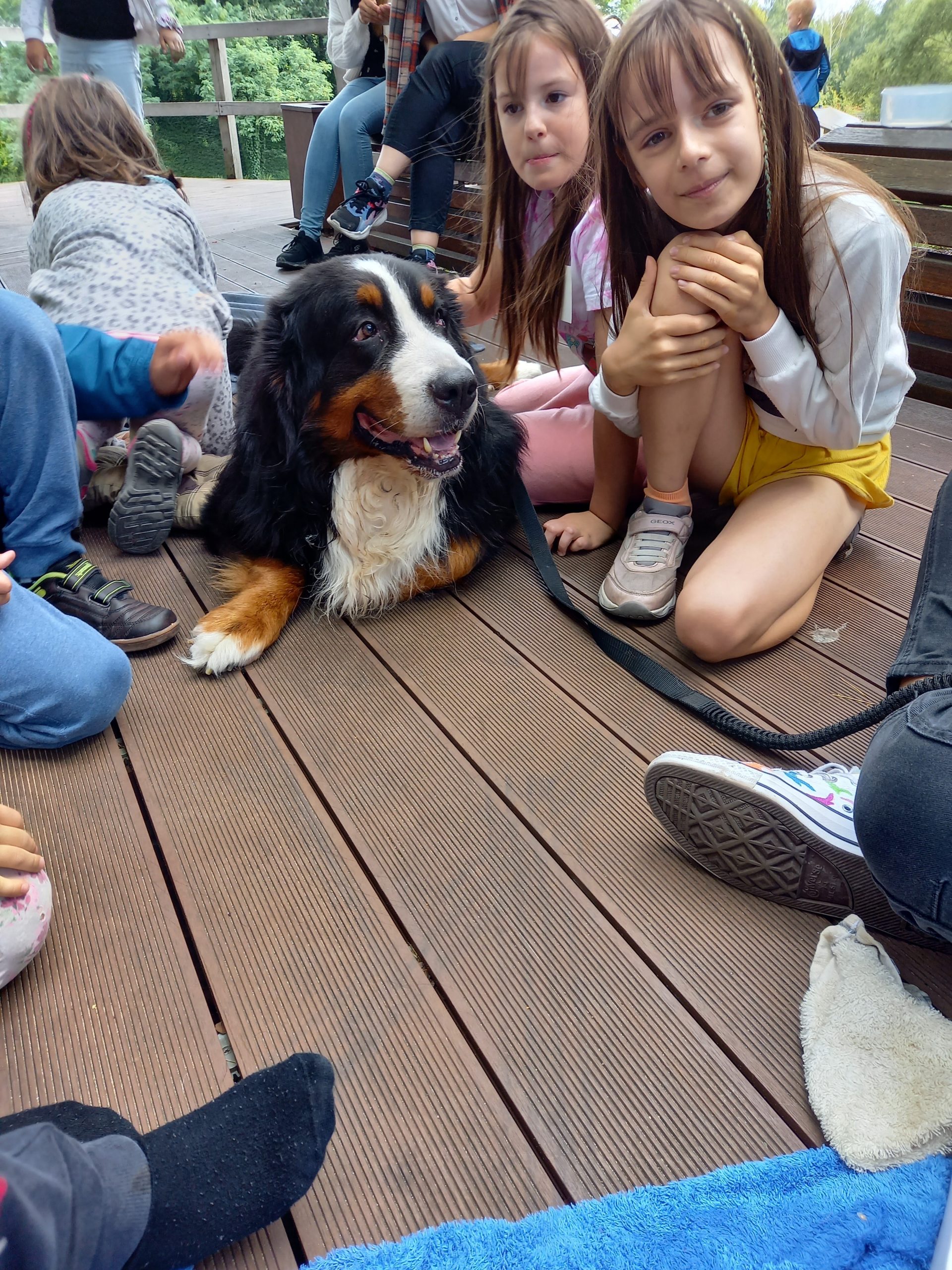 Czy zwierzęta pracują i w czym pomagają ludziom konie, wielbłądy, osiołki i psy? O tym rozmawialiśmy z panią Klarą na dzisiejszym spotkaniu Lata na Górkach. Dużo mówiliśmy o psach, które bardzo często pracują z ludźmi i dla ludzi. Opowiedzieliśmy sobie o psach pociągowych, które pomagają w podróżach na dalekiej północy i wielbłądach ciężko pracujących na pustyniach. Pani Klara opowiedziała o psach przewodnikach, psach ratownikach, psach strażnikach i psach terapeutach – takim właśnie psem jest jej podopieczny Harry. Mimo że duży i groźnie wyglądający, to okazał się być kochanym przytulakiem i łakomczuchem (zjadł wszystkie przysmaczki i psie kiełbaski, które podsuwały mu pod pyszczek dzieci). Dał się głaskać i pokazał, że potrafi bardzo skutecznie szukać. Na co dzień Harry pomaga dzieciom poczuć się dobrze i jest w tym najlepszy.