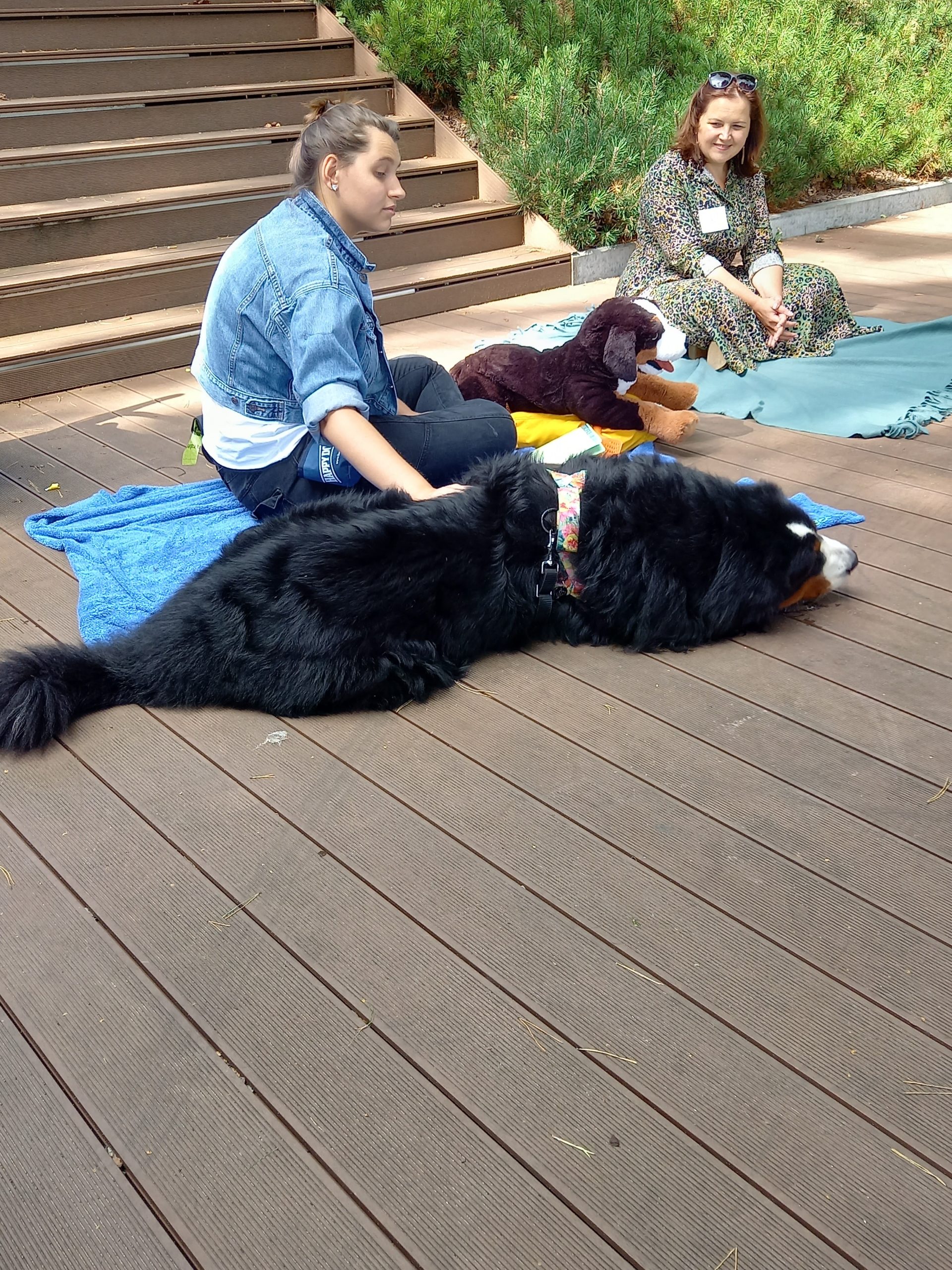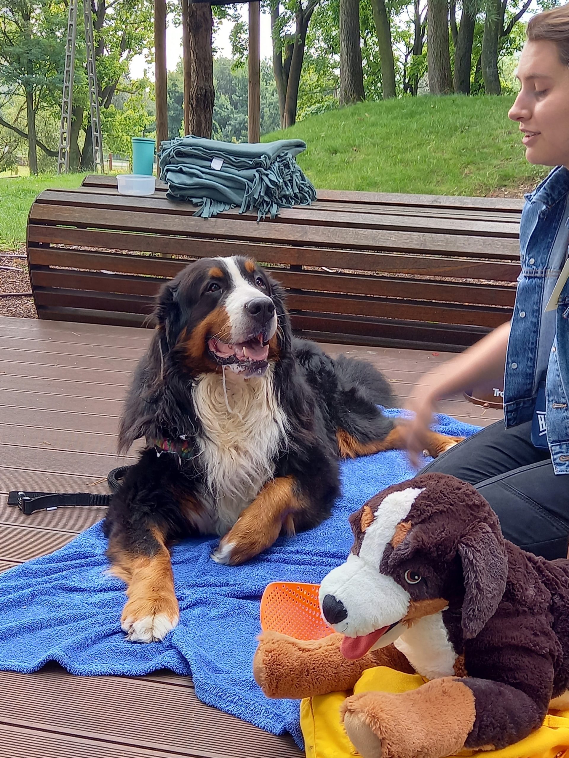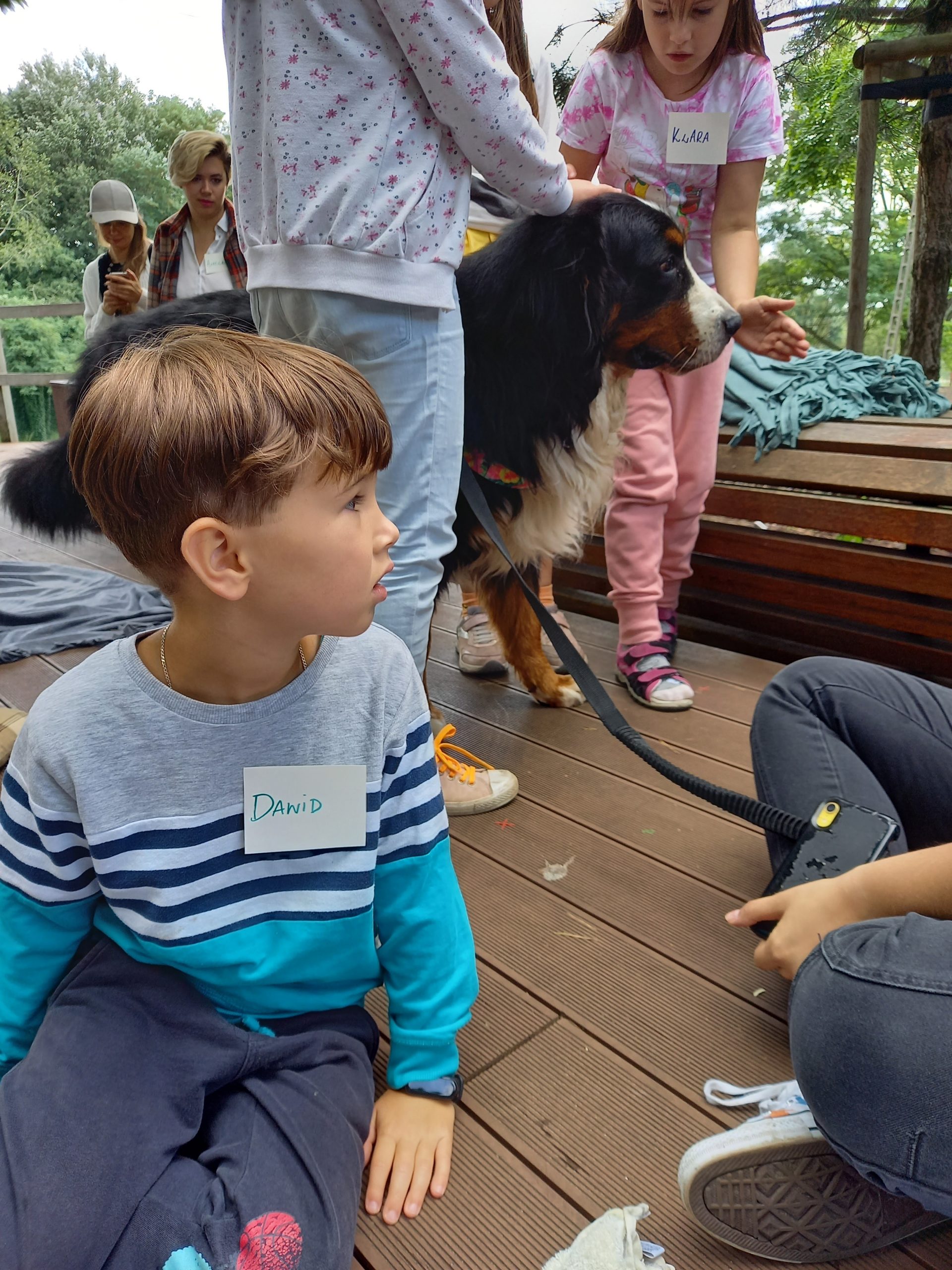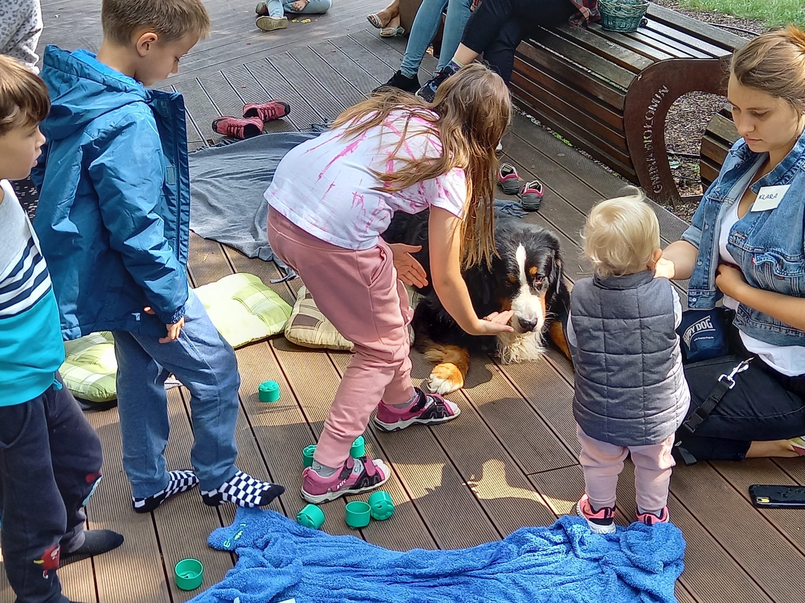 Czy zwierzęta pracują i w czym pomagają ludziom konie, wielbłądy, osiołki i psy? O tym rozmawialiśmy z panią Klarą na dzisiejszym spotkaniu Lata na Górkach. Dużo mówiliśmy o psach, które bardzo często pracują z ludźmi i dla ludzi. Opowiedzieliśmy sobie o psach pociągowych, które pomagają w podróżach na dalekiej północy i wielbłądach ciężko pracujących na pustyniach. Pani Klara opowiedziała o psach przewodnikach, psach ratownikach, psach strażnikach i psach terapeutach – takim właśnie psem jest jej podopieczny Harry. Mimo że duży i groźnie wyglądający, to okazał się być kochanym przytulakiem i łakomczuchem (zjadł wszystkie przysmaczki i psie kiełbaski, które podsuwały mu pod pyszczek dzieci). Dał się głaskać i pokazał, że potrafi bardzo skutecznie szukać. Na co dzień Harry pomaga dzieciom poczuć się dobrze i jest w tym najlepszy.