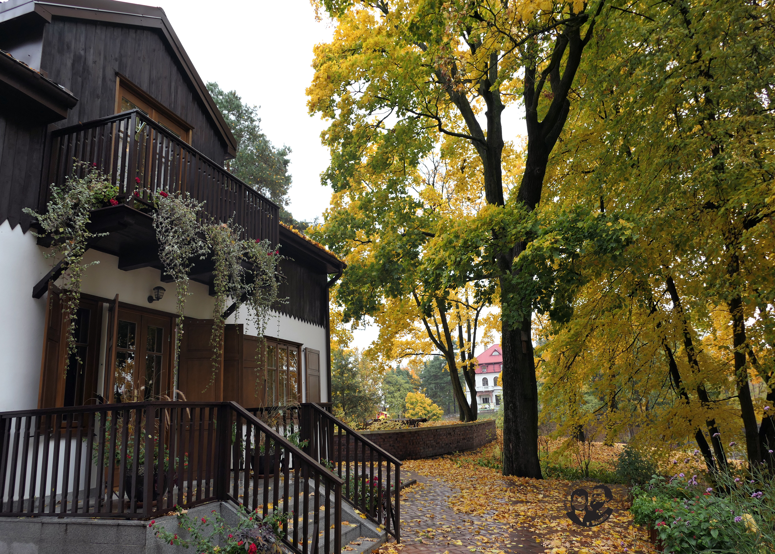 Fotografia współczesna, kolorowa, wykonana jesienią 2021 roku. Na zdjęciu po lewej stronie widoczna południowa elewacja budynku w ujęciu ¾ z widocznymi balkonem, tarasem, otwartymi okiennicami i roślinami ozdobnymi w donicach. Po lewej stronie fotografii widoczny fragment parku. Największym drzewem jest klon, z dobrze widocznym pniem i częścią korony. Klon oraz inne drzewa mają żółte liście. Taras okalający budynek pokryty opadłymi żółtymi liśćmi.