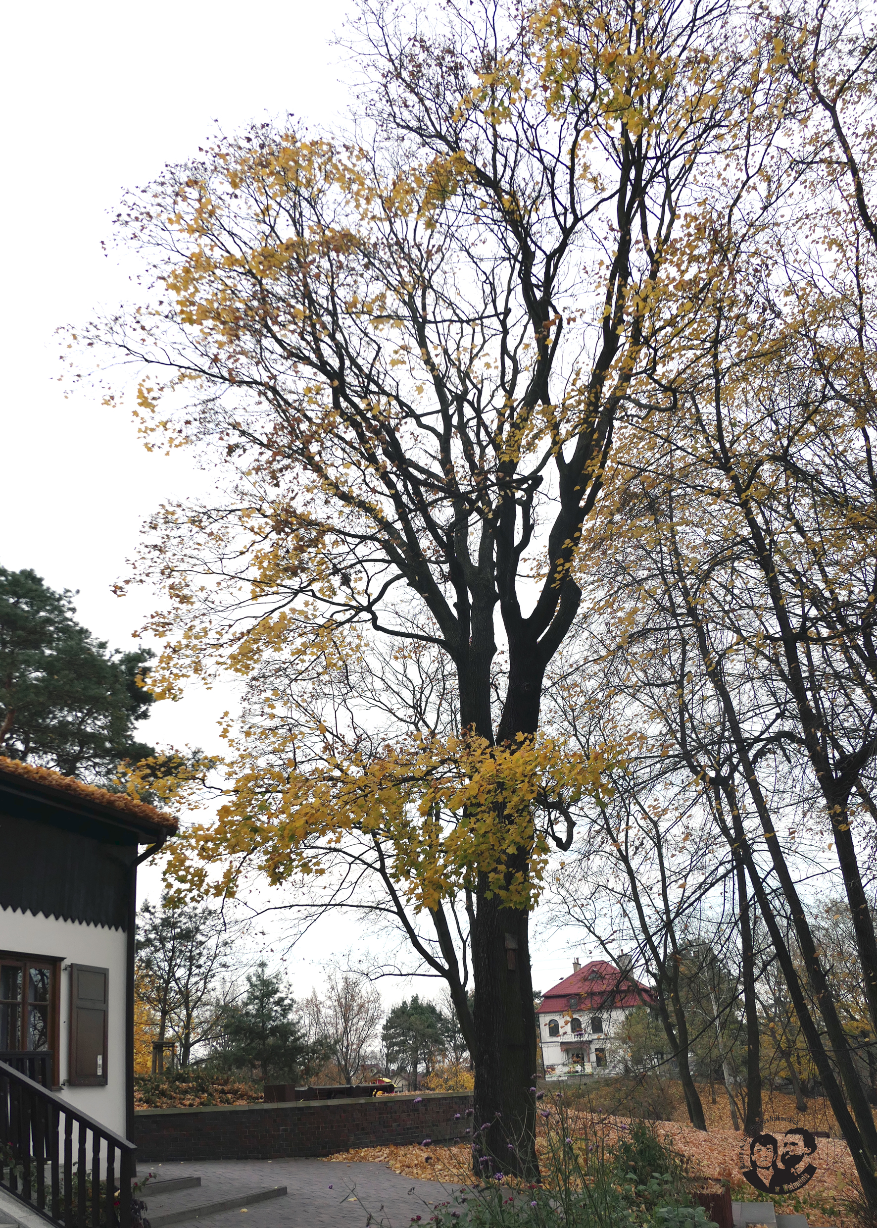 Fotografia współczesna, kolorowa, wykonana jesienią 2021 roku. Zdjęcie wykonane z wschodnio-północnego narożnika domu. W prawym dolnym rogu widzimy fragment murku oporowego wybudowanego z czerwonej cegły, tej samej z której ułożony jest taras okalający budynek. Z prawej strony fotografii na drugim planie widać pień klonu i pierwsze gałęzie korony. Na pierwszym planie z prawej strony wschodnia ściana budynku, z balkonem na piętrze i otwartą okiennicą tarasu na parterze budynku. Tło, dla opisanych obiektów, stanowią gałęzie drzew rosnących w pobliżu domu. Liście na wszystkich drzewach są żółte.