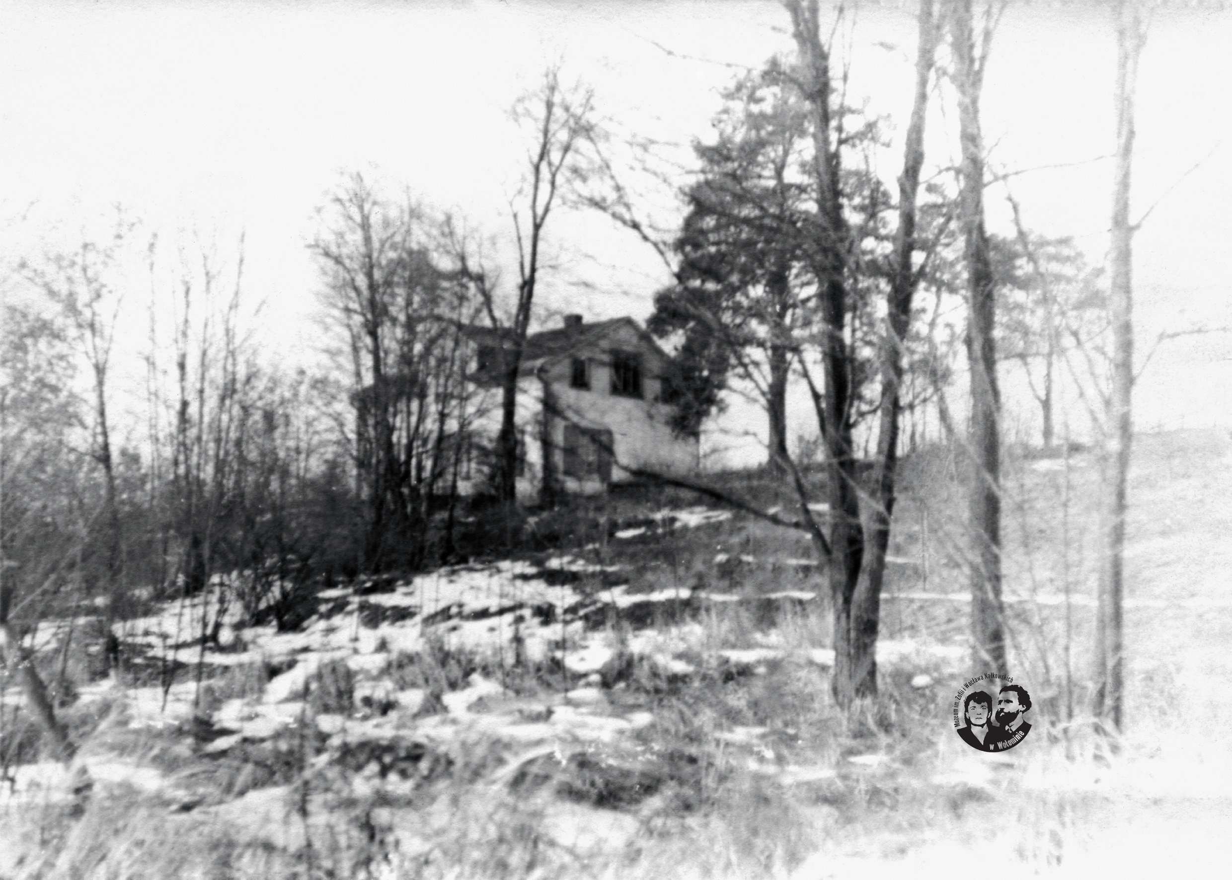 Fotografia archiwalna, czarno-biała, wykonana zimą po 1937 roku a przed latami sześćdziesiątymi XX wieku. Na zdjęciu widać na pierwszym planie zbocze górki z nielicznymi drzewami. W centralnej części zdjęcia, w oddaleniu widoczne dwie ściany budynku: wschodnia i południowa. Dość wyraźnie widoczny na tle południowej ściany klon, wysoki z małą koroną.
