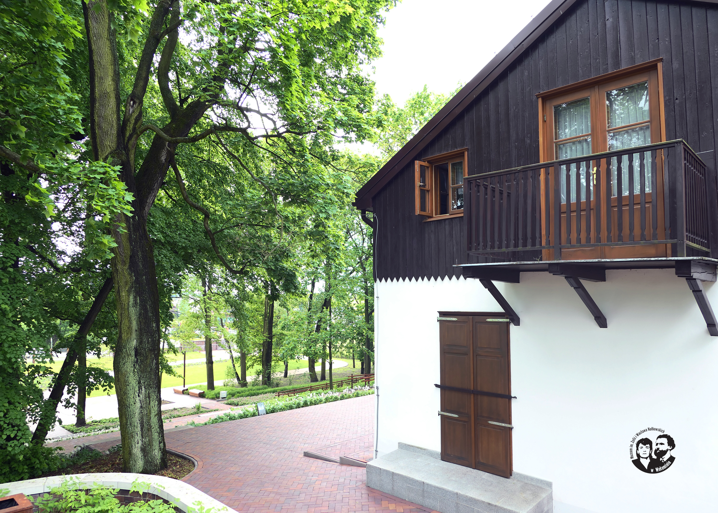Fotografia współczesna kolorowa, wykonana wiosną 2021 roku, przedstawiająca wschodnią ścianę zewnętrzną budynku Muzeum wraz z częścią tarasu okalającego budynek i klonem. Na ścianie budynku, widoczny na piętrze wykończonym drewnianą boazerią w kolorze brązowym, balkon z barierką z pionowych deseczek również w kolorze brązowym i uchylone małe okienko obok. Na parterze budynku widoczna zamknięta okiennica tarasu wyjściowego. Klon z widocznym wyraźnie pniem pokrytym od strony wschodnio-północnej delikatnym porostem oraz zieloną koroną. Taras z cegieł w kolorze czerwonym.