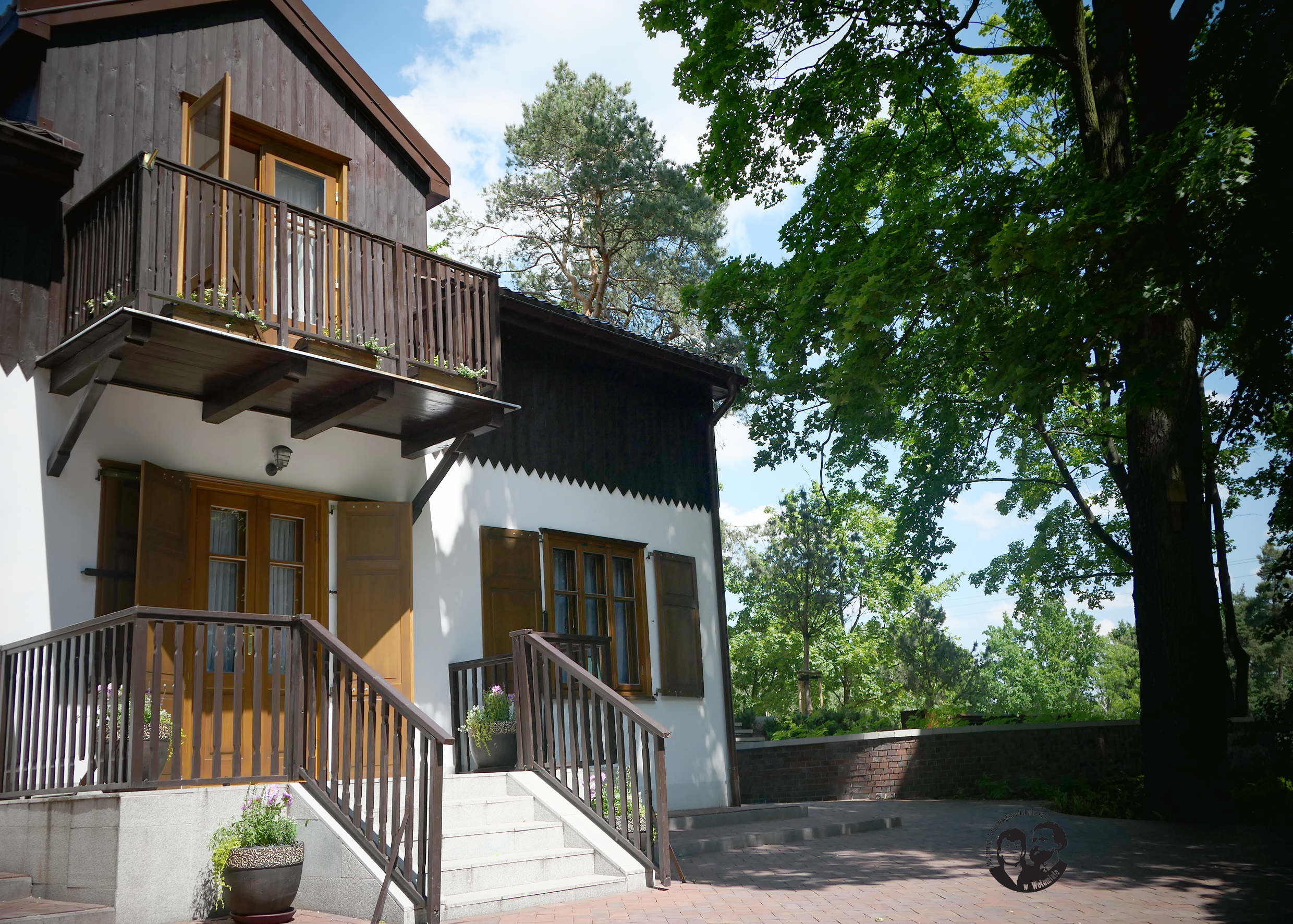 Fotografia kolorowa współczesna, wykonana latem 2020 roku. Zdjęcie przedstawiające południową elewację budynku w ¾, z widocznym z prawej strony klonem. Budynek oświetlony światłem dziennym, jasnym. Widoczny na fotografii balkon na piętrze z balustradą z pionowych brązowych deseczek, uchylonymi drzwiami balkonowymi i doniczkami na rośliny ozdobne. Na parterze dobrze widoczny taras ze schodami po środku i balustradą z pionowych deseczek. Na tarasie, przy drzwiach z otwartymi okiennicami, okrągłe donice z roślinami ozdobnymi. Taras okalający budynek z czerwonych cegieł. Klon widoczny z prawej strony zdjęcia, w lekkim cieniu. Klon znacznie wyższy od budynku.