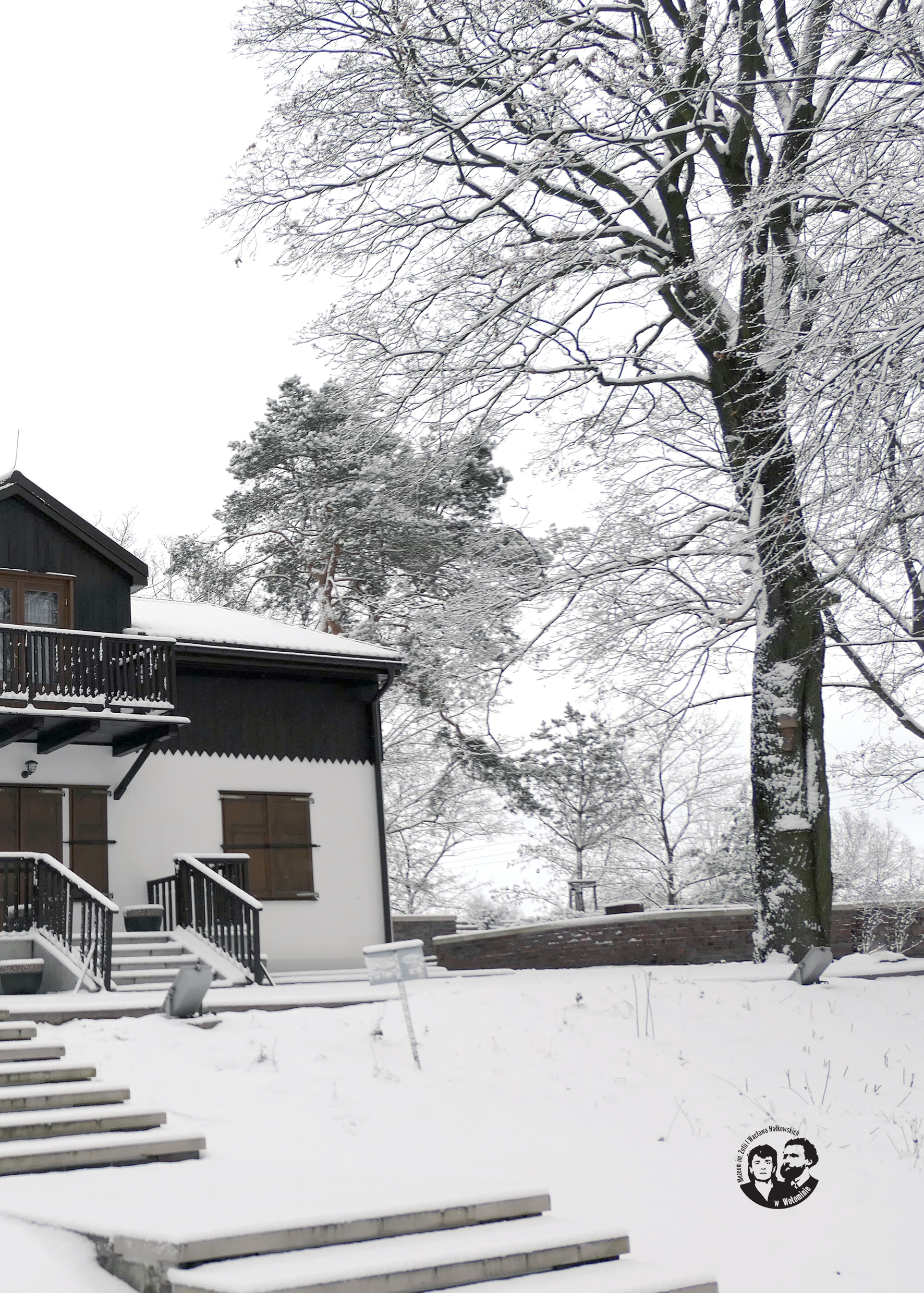 Fotografia współczesna, kolorowa, wykonana zimą 2020 roku. Pionowa. Z lewej strony widoczna ½ południowej elewacji budynku z zamkniętymi okiennicami w oknach oraz schody prowadzące ze środkowego tarasu na najwyższy. Dach budynku, schody oraz tarasy i drzewa pokryte śniegiem. Z prawej strony zdjęcia dobrze widoczny klon. Ośnieżony, bez liści, znacznie wyższy od domu. Na tej fotografii widać jak dużym jest drzewem.