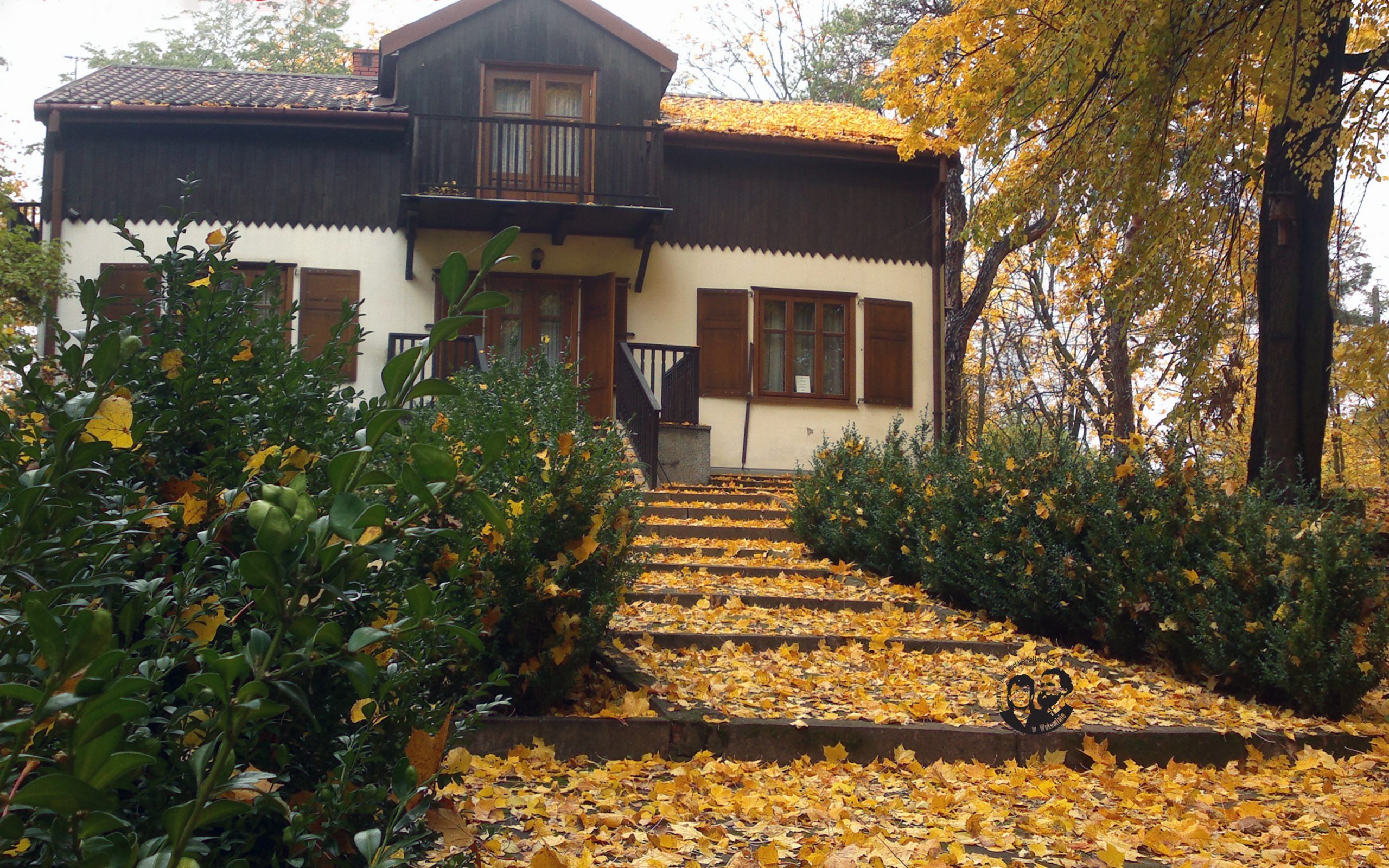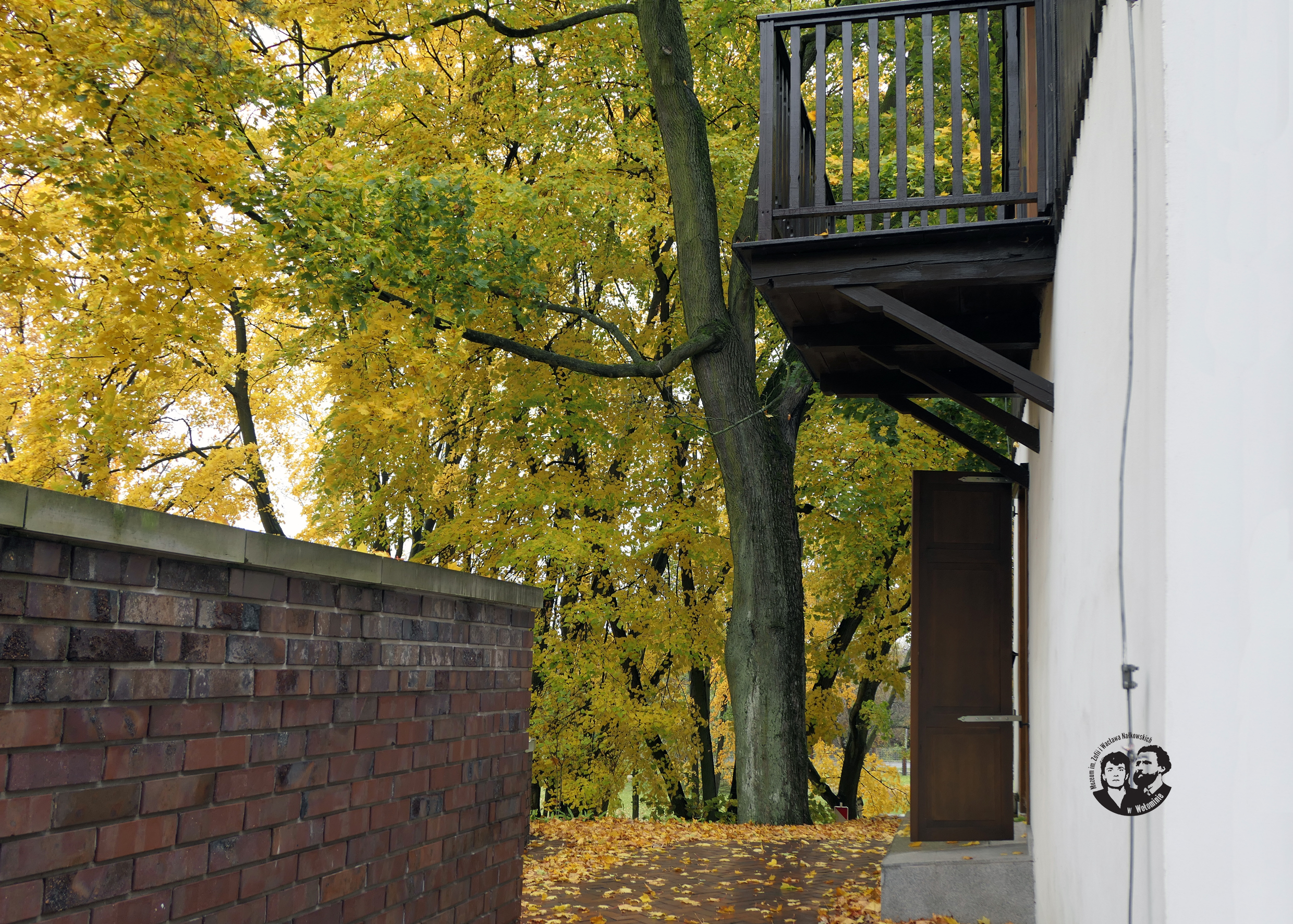 Fotografia archiwalna, kolorowa, wykonana jesienią, przed 2018 rokiem. Na zdjęciu widoczna cała południowa elewacja budynku. Wizerunek domu zajmuje górna połowę zdjęcia. W dolnej połowie widać schody prowadzące do Muzeum w ich dawnym biegu oraz zielone bukszpany. Z prawej strony widoczny klon w jesiennej szacie. Liście są jeszcze na drzewie, ale maja już żółty kolor. Dach domu, schody i rośliny przykryte opadłymi żółtymi liśćmi.