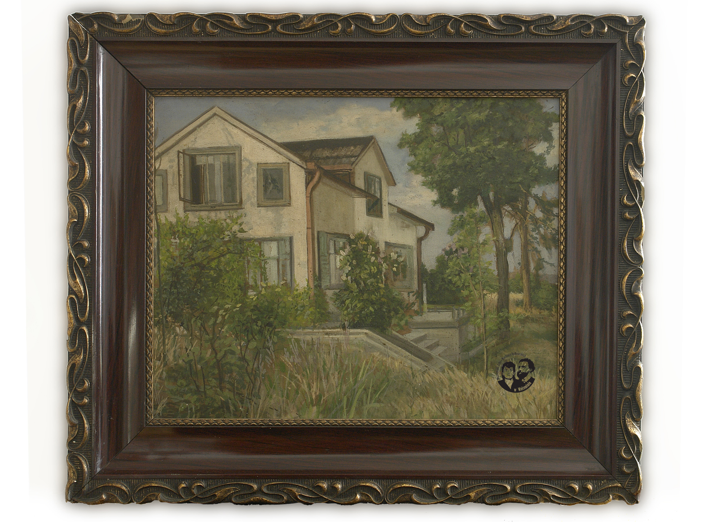 Zdjęcie kolorowe, przedstawiające obraz olejny w szerokiej ciemnej ramie ze zdobionym brzegiem. Na obrazie widoczny budynek w wyglądzie z lat 1938-1990. Widoczne dwie ściany: zachodnia i południowa oraz schody i mały taras przy domu. Z prawej strony obrazu klon z wyraźnym pniem i znaczną częścią korony. Obraz przestawiający wygląd domu i otoczenia w okresie letnim. U dołu obrazu na pierwszym planie wysokie trawy i niezidentyfikowane krzewy.