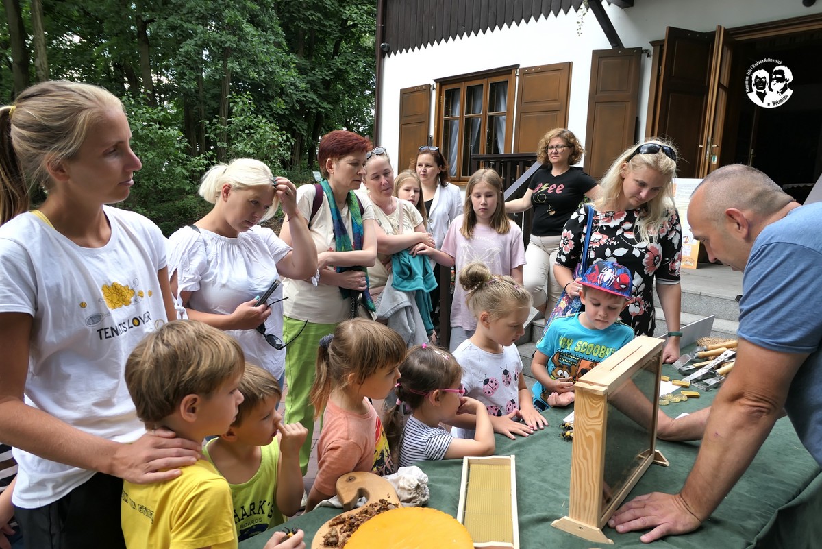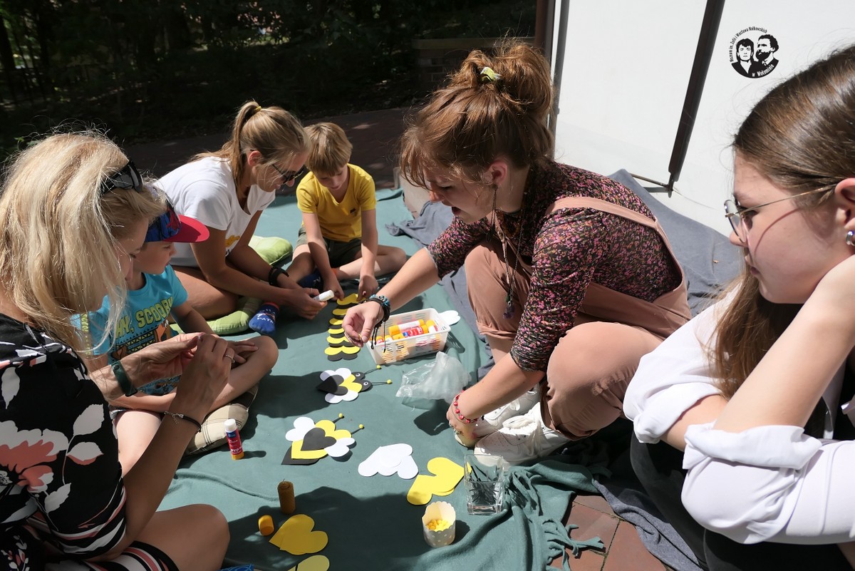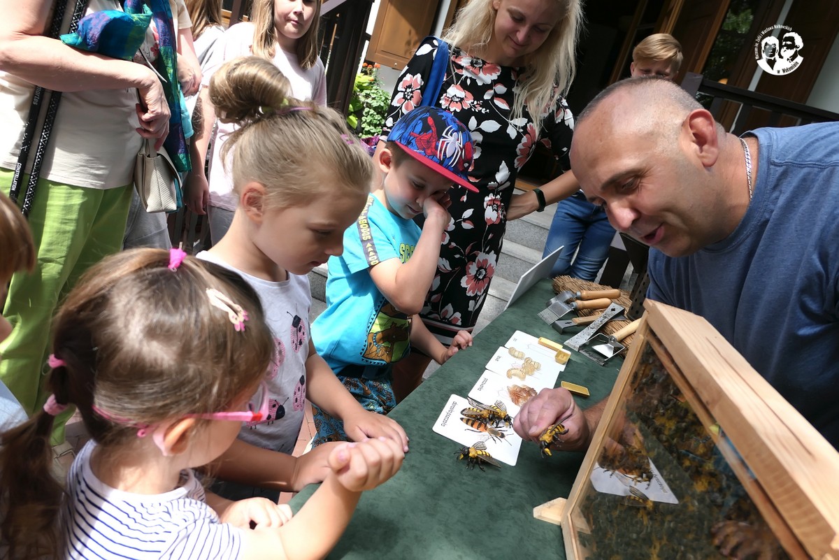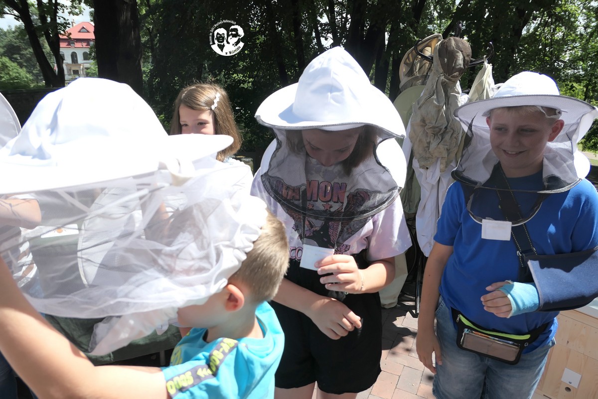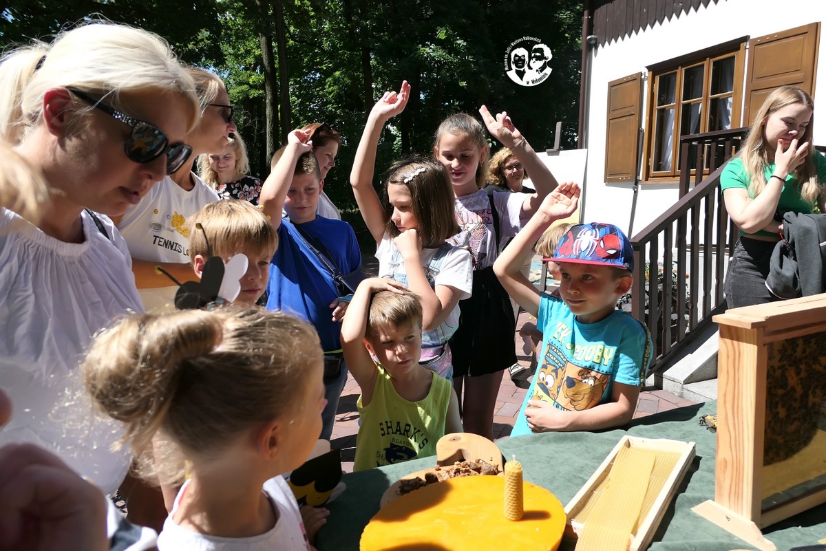 W piękne lipcowe przedpołudnie w „Domu nad Łąkami” gościło wiele pszczółek: i tych w ulu, które można było podglądać, i tych bardzo pracowitych, które robiły świeczki z wosku i papierowe serduszkowe pszczoły. O życiu i zwyczajach tych niesamowitych przyjaciółek ludzi i roślin opowiadał pan Borys. Najodważniejsi mogli też założyć strój, w którym pszczelarze dziś pracują przy ulach oraz taki, który miał sto lat!