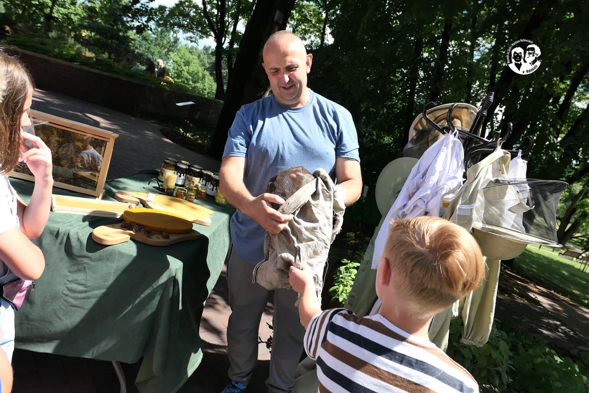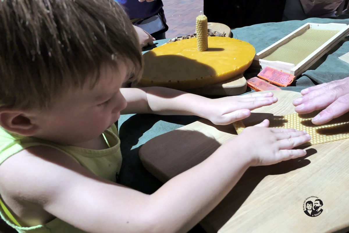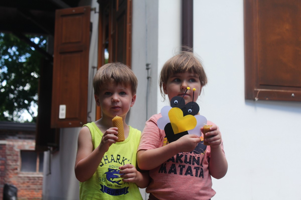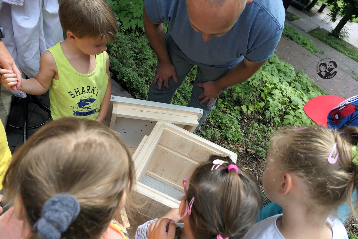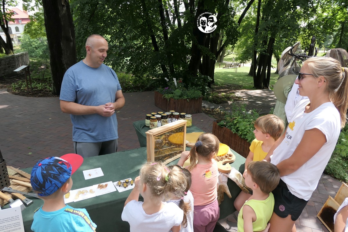 W piękne lipcowe przedpołudnie w „Domu nad Łąkami” gościło wiele pszczółek: i tych w ulu, które można było podglądać, i tych bardzo pracowitych, które robiły świeczki z wosku i papierowe serduszkowe pszczoły. O życiu i zwyczajach tych niesamowitych przyjaciółek ludzi i roślin opowiadał pan Borys. Najodważniejsi mogli też założyć strój, w którym pszczelarze dziś pracują przy ulach oraz taki, który miał sto lat!
