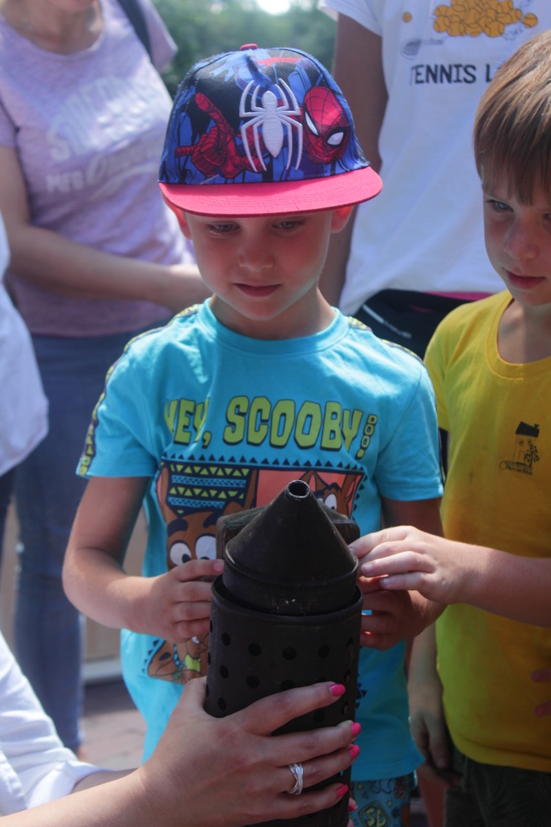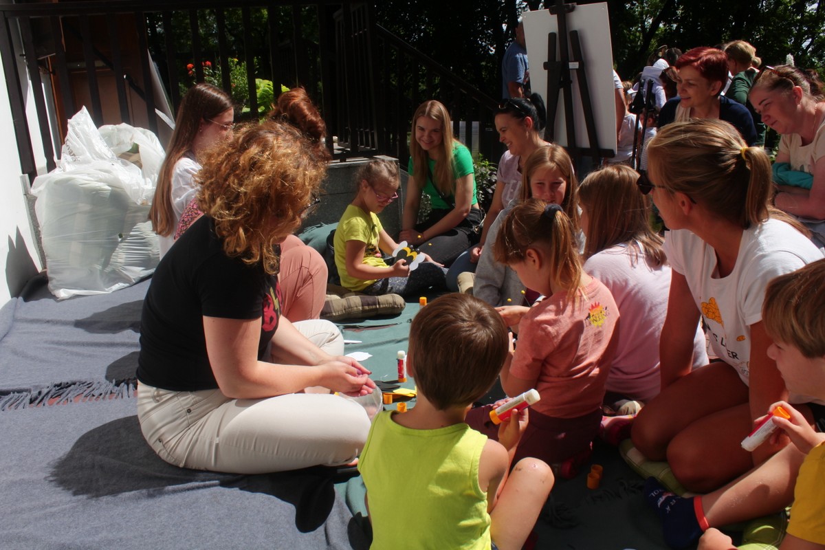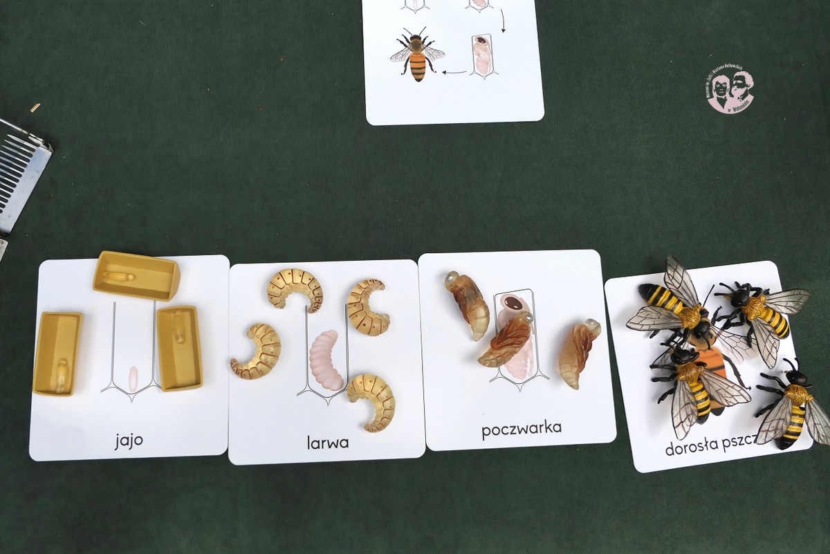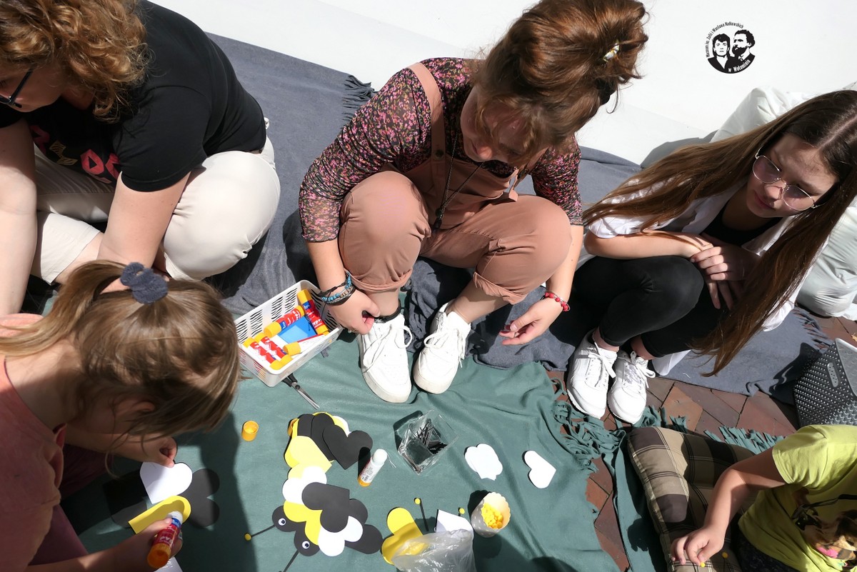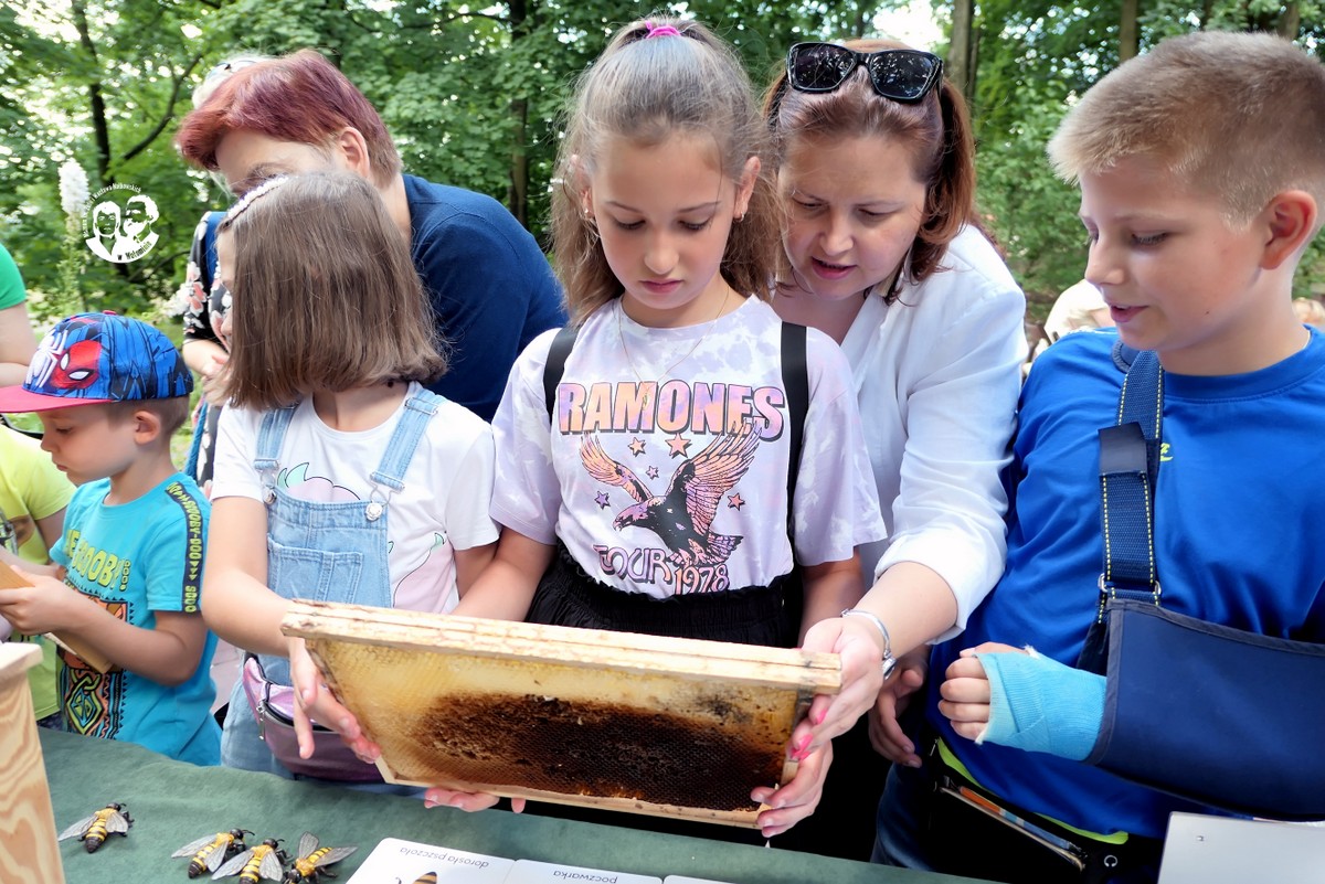 W piękne lipcowe przedpołudnie w „Domu nad Łąkami” gościło wiele pszczółek: i tych w ulu, które można było podglądać, i tych bardzo pracowitych, które robiły świeczki z wosku i papierowe serduszkowe pszczoły. O życiu i zwyczajach tych niesamowitych przyjaciółek ludzi i roślin opowiadał pan Borys. Najodważniejsi mogli też założyć strój, w którym pszczelarze dziś pracują przy ulach oraz taki, który miał sto lat!