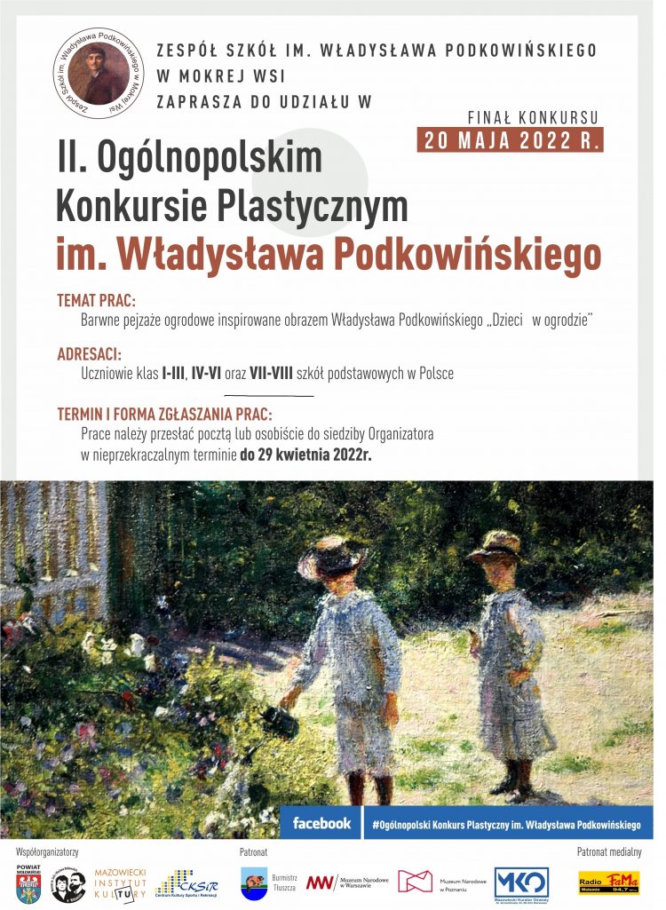 Serdecznie zachęcamy dzieci i młodzież do udziału w konkursie plastycznym organizowanym po raz drugi przez Zespół Szkół im. Władysława Podkowińskiego w Mokrej Wsi. Tegoroczna edycja odbywa się pod hasłem „Barwne pejzaże ogrodowe inspirowane obrazem Władysława Podkowińskiego „Dzieci w ogrodzie””.