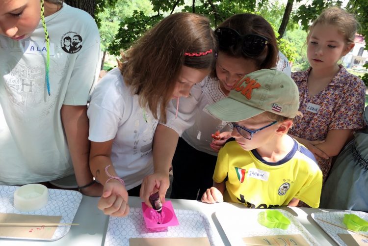 Mydlarki i mydlarze stawili się przy swoich warsztatach w środę punktualnie o 11, by wyczarować pod okiem pań Eweliny i Hani wspaniałe, pachnące i kolorowe mydełka. Praca szła sprawnie, choć wcale wytwarzanie mydła nie jest łatwą sztuką, ale efekty warte były czasu i zaangażowania. Gdy mali rzemieślnicy ciężko pracowali przy mydłach, a później przy obrazkach decoupage, opiekunowie mieli chwilę dla siebie i rozmowę z panią Pauliną o tym, jak ważne jest zapewnienie dzieciom higienicznego trybu życia.