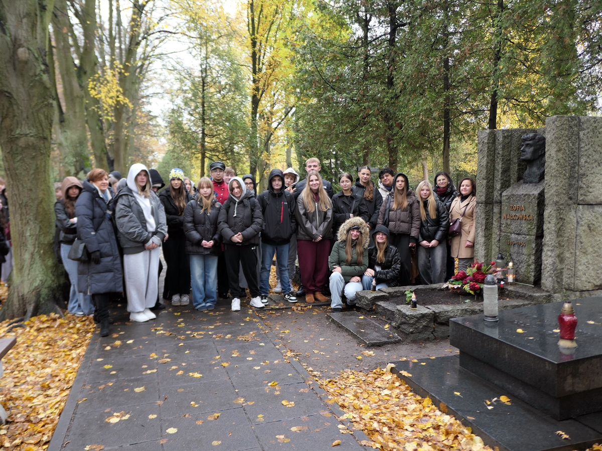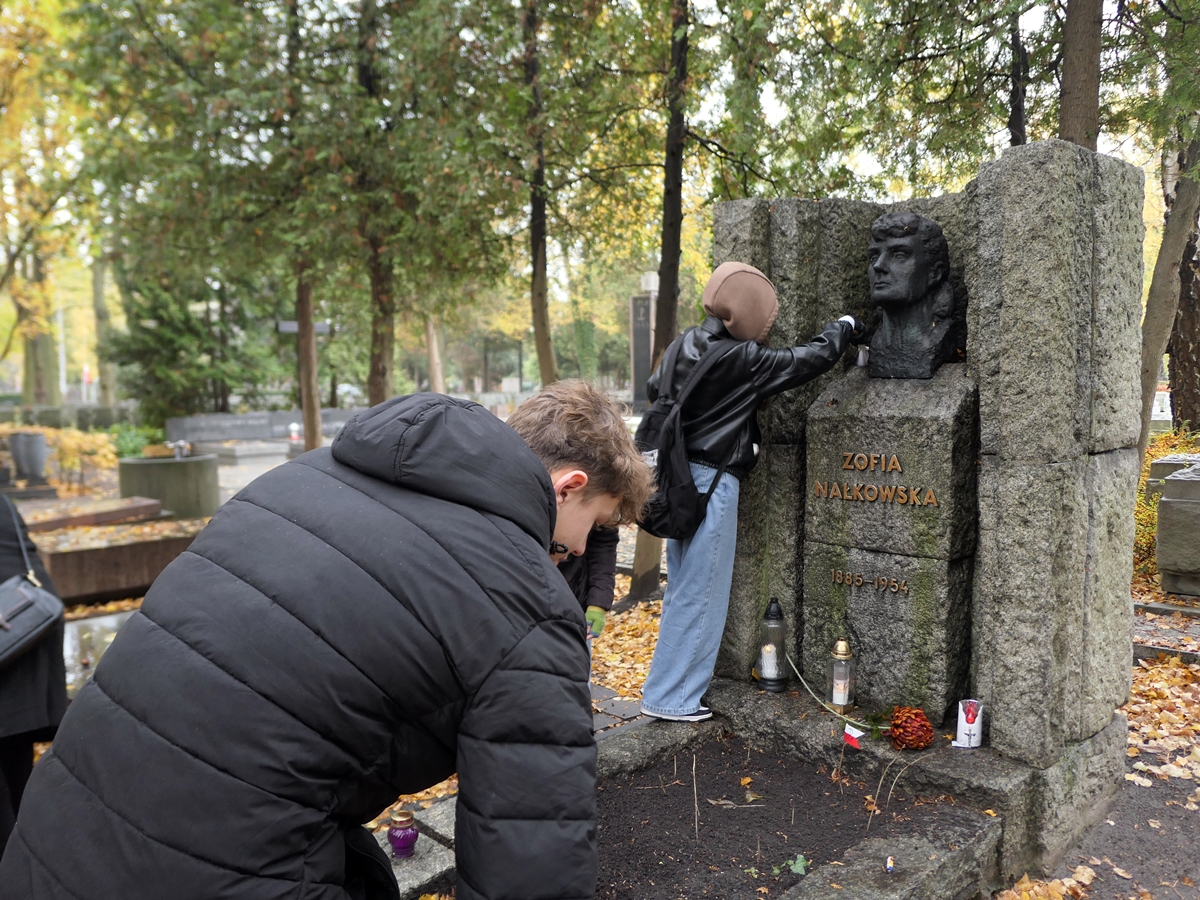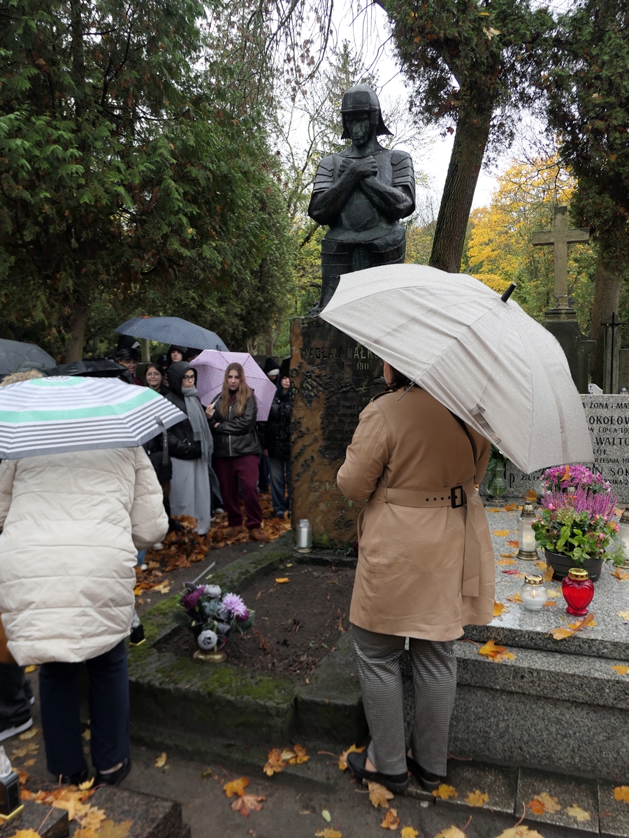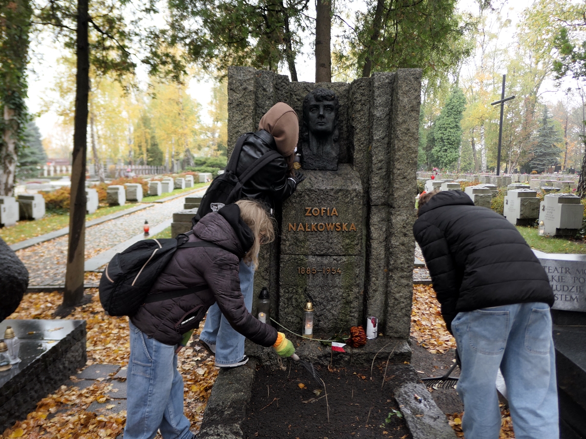 Piękna złota jesień zadomowiła się już u nas. To znak, że nadchodzi czas gdy powinniśmy powspominać tych, którzy odeszli. W nadchodzących dniach będziemy częściej jeździć na cmentarze, zapalać światełka na grobach ludzi nam bliskich. Jak co roku pracownicy Muzeum im. Zofii i Wacława Nałkowskich odwiedzili Cmentarze Powązkowskie, by przygotować groby patronów na 1 listopada. W tym razem towarzyszyła nam młodzież z I LO im. Wacława Nałkowskiego w Wołominie z klas 1b i 1h wraz z opiekunami i p. dyr. Jolantą Mosak. Pomimo że aura nie była dla nas przychylna, udało się uporządkować oba groby i zrobić małe spacery po nekropoliach. Nie da się ukryć, że Powązki nawet w deszcz mają jesienią swój niepowtarzalny urok.